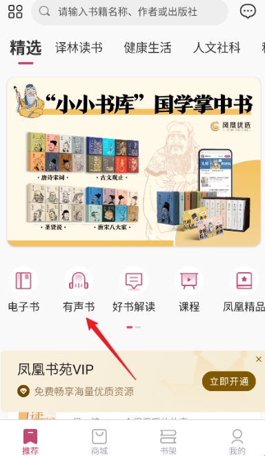 1、打开凤凰书苑App,在首页点击【有声书】入口;