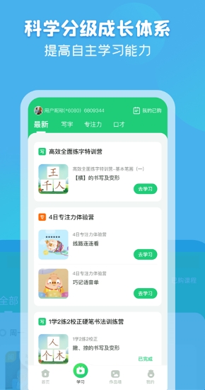 平台内汇集了丰富的写字课程、阅读课程以及多样化的少儿课程,还覆盖语文、数学、英语等多学科内容,帮助孩子系统掌握知识,提升学习能力。