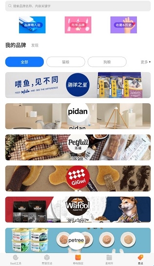 5、最后关于“卖点”,这里聚集了许多品牌,既有常见猫粮、狗粮的售卖,还有玩具、洗浴用品、医疗、日用以及零食等各类商品。