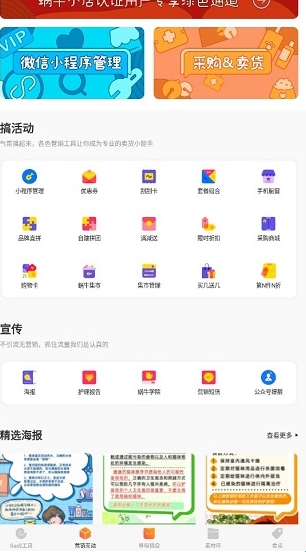 3、营销互动同样有助于商家进行各种线上互动,在搞活动里包括小程序管理,优惠券、刮刮卡以及宣传功能里的海报、蜗牛学院等等。