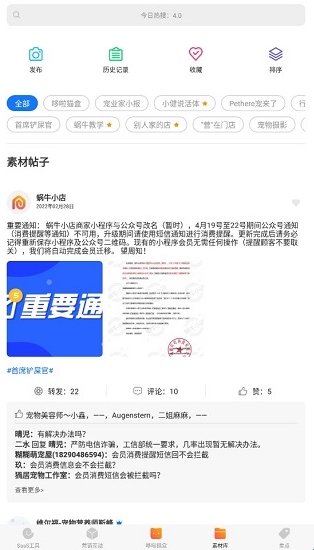 4、软件里的素材库类似“朋友圈”,因此这里具备一定的社交属性,商家朋友可以在这里寻找新的灵感,也可以发布宣传或活动。参与话题讨论,结识更多新朋友。