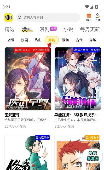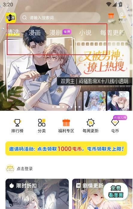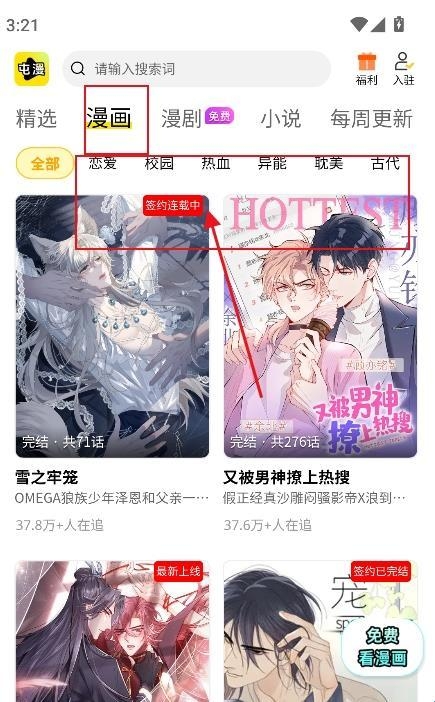 2、例如切换到漫画板块,可以根据漫画分类选择喜好的内容