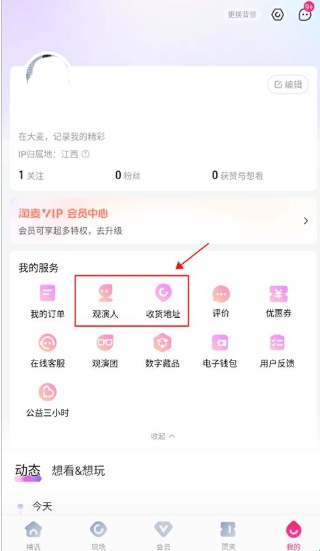 1、首先在我的界面中将观演人和收货地址信息填写完整。