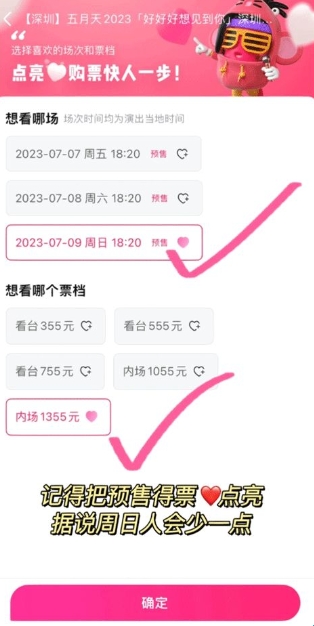 6、抢票攻略设置完成后,接着将你要观看的场次和票档后面的红心点上,这样在抢票时打开此界面就会直接默认为该场次和票档,就不用在浪费时间再点一次了。