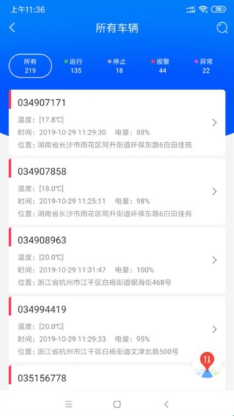 3、车辆信息展示:通过卡片形式展示车辆信息,包含丰富的车辆数据,实时更新车辆状态并自动分类展示。