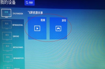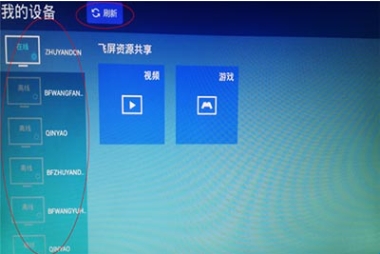 4、进入飞屏页面后,您将在左侧看到若干电脑名称,这些电脑都是曾经与电视产生过飞屏连接的设备,或当前与本电视同在一个网络内、且已经开启飞屏功能的设备。您可以看到这些设备的当前状态是“在线”或“离线”,您只能选择在线设备连接。如果没有找到您的设备,您可以选择页面顶部的“刷新”按钮,尝试重新找到您的设备。与设备连接无需确认操作,只要通过遥控器选择至对应名称的设备上即可自动连接。(如果该设备设置了连接密码,则需要输入密码后才能连接)。
