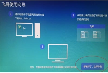 3、进入飞屏后,您将首先看到一个简单的使用向导页面,页面中的内容在本教程中的开始部分也已经详细描述过了。使用遥控器选择右下角的“都装好了,立即体验”按钮,点击确定后正式进入飞屏页面。
