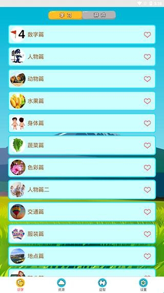 1、进入看图识字app后,找到【识字】页面,我们就能看到一些常用的学习和游戏内容,如数字篇、人物篇、动物篇等。