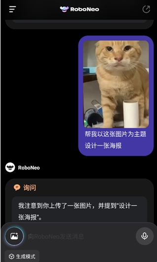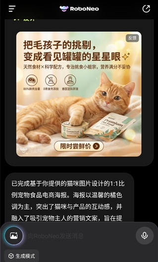 2、向RoboNeo提出你的编辑需求,比如以下图为例,要求根据图片生成一张1:1的海报。